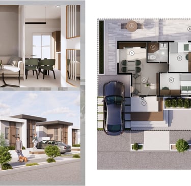 At the back, a dedicated service area enhances functionality, providing extra space for laundry, storage, or utility needs. The house is designed with practicality in mind, balancing comfort and efficiency in a single-storey layout that is ideal for families seeking a cozy yet well-structured home.