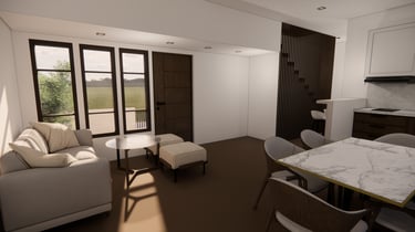 As you enter the Elijah 120 SQM 2-Storey Duplex, you're welcomed by a covered porch leading into a bright and airy living area. The open-concept design seamlessly connects the living, dining, and kitchen areas, creating a spacious and inviting atmosphere. Large windows allow natural light to flow in, enhancing the home’s warmth and openness.